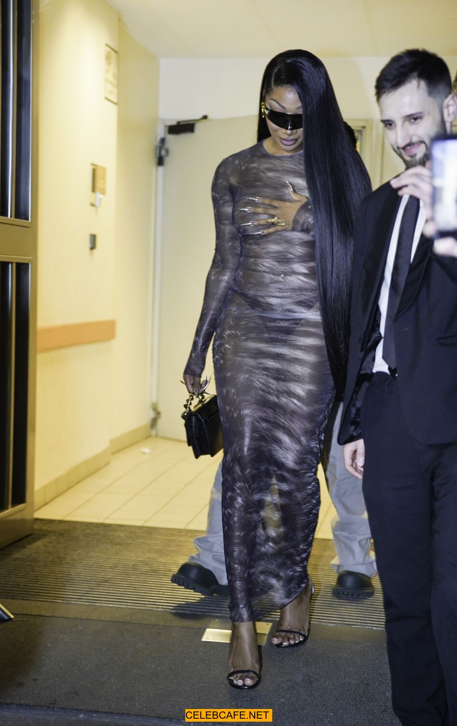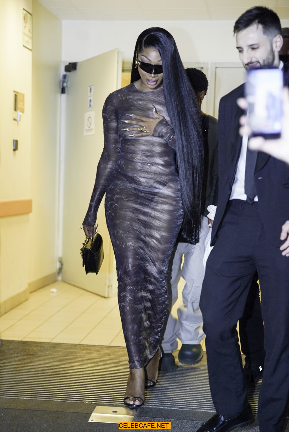 Megan Thee Stallion braless in sheer dress before the runway of Roberto Cavalli show in Milan