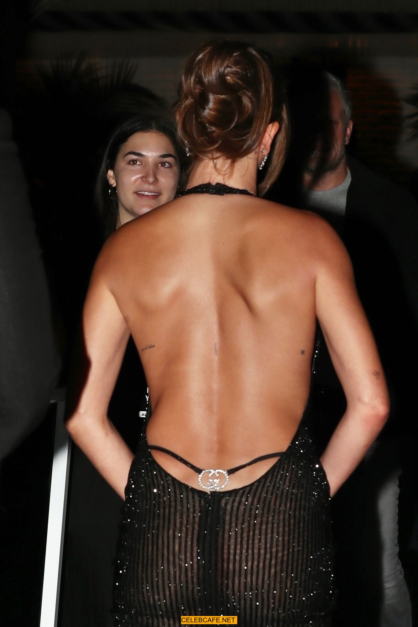 Hailey Bieber braless in sheer black dress at GQ Men of the Year party