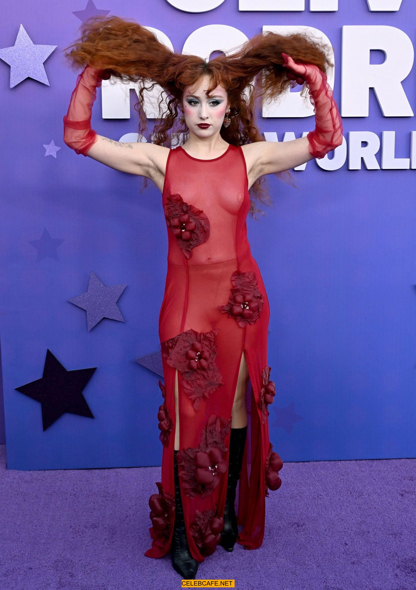 Chappell Roan braless in see through red dress at Olivia Rodrigo: GUTS World Tour premiere
