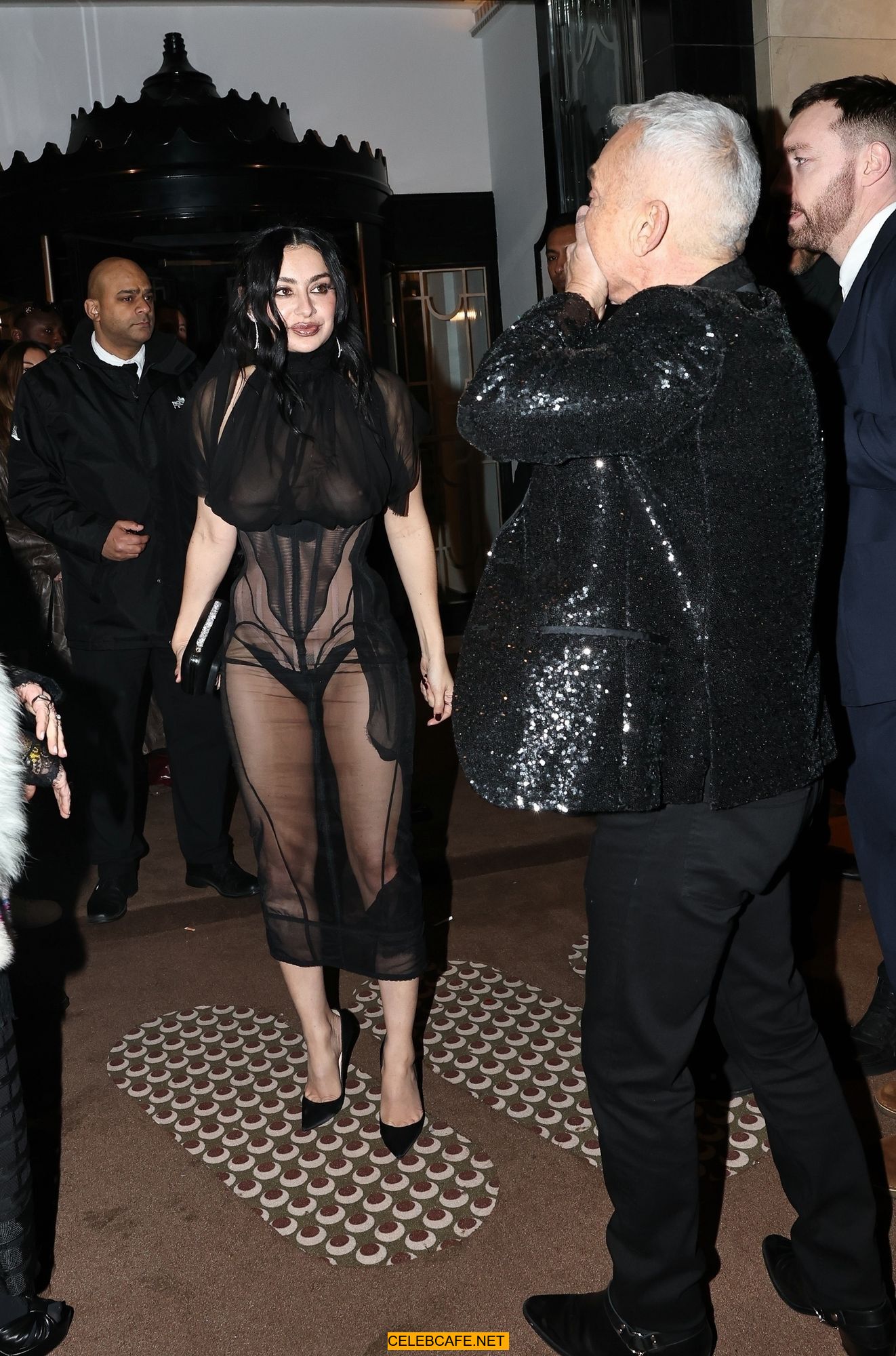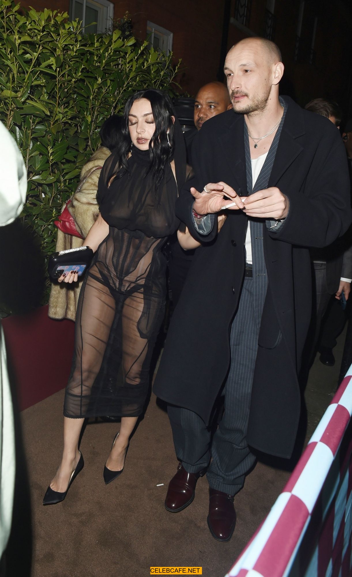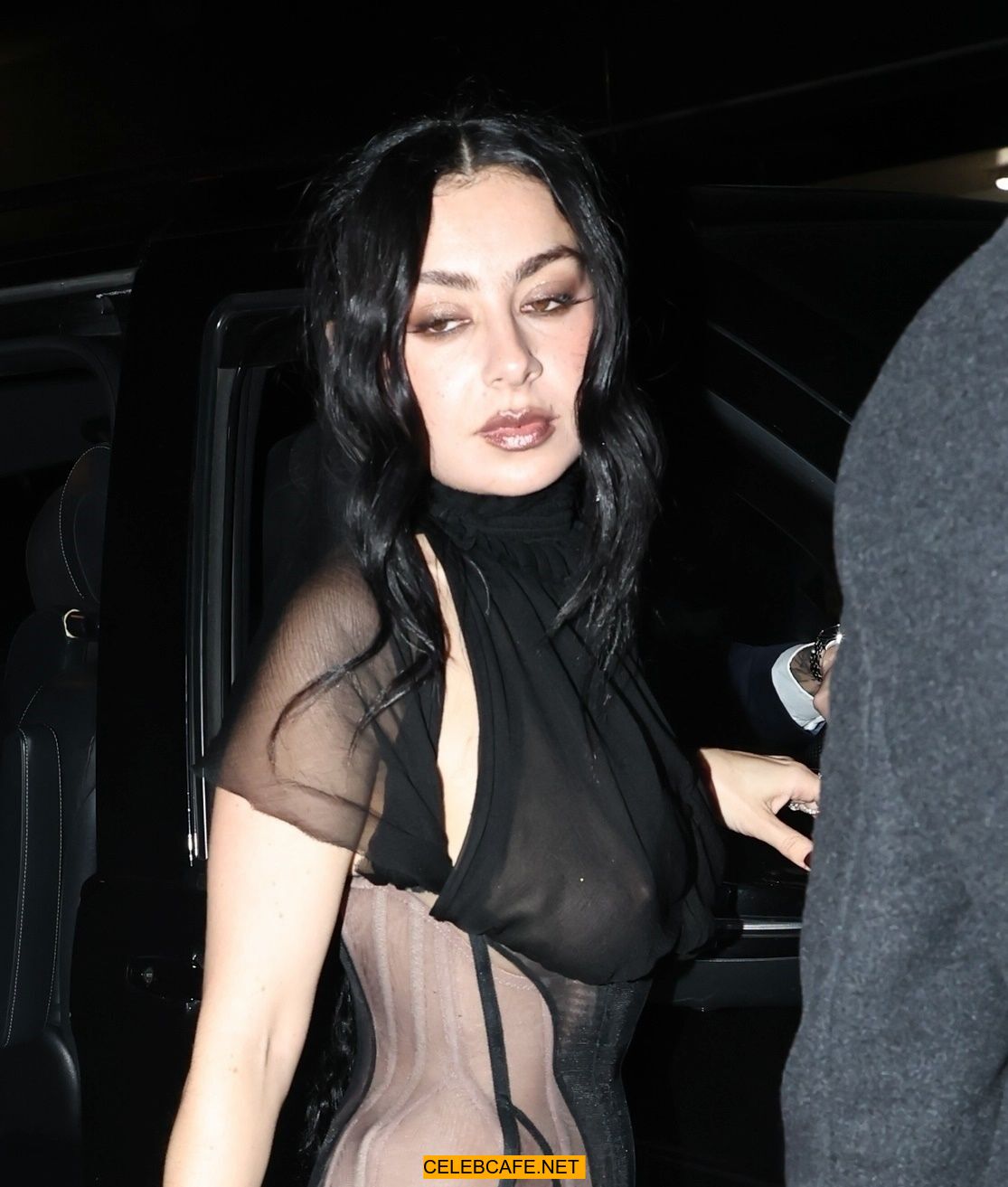 Charli XCX braless in sheer dress arrives at the Warner Music Brit Awards after party at Claridges Hotel in London
